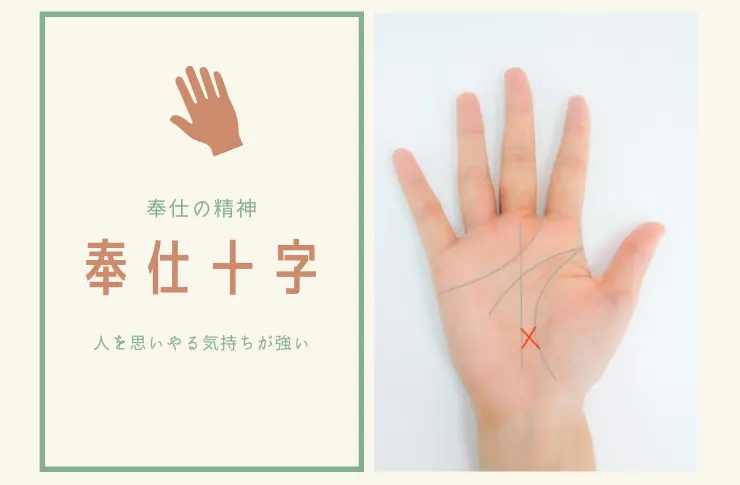 生命線と運命線との間にあらわれる十字形を奉仕十字線(お助け十字線)といいます。この線がある人は、人のために尽くす気持ちが強い人。思いやりと優しさにあふれ、困った人がいると手を差し伸べずにはいられません。家族思いで面倒見のよい人であること... -
