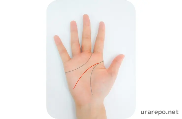 【見た目】 スタート地点は同じですが、途中から手首の小指側にあるふくらみ(月丘)に向かって、なだらかに垂れ下がるように伸びる線です。長さがあるほどカーブも大きくなります。