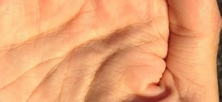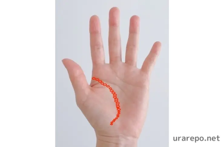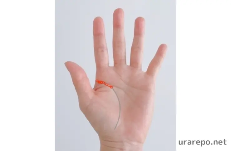 生命線の始まりから終わりまで、細かな輪が連続して見えるタイプです。線がやや薄めで、よく見ると小さな凹凸が続く手相です。